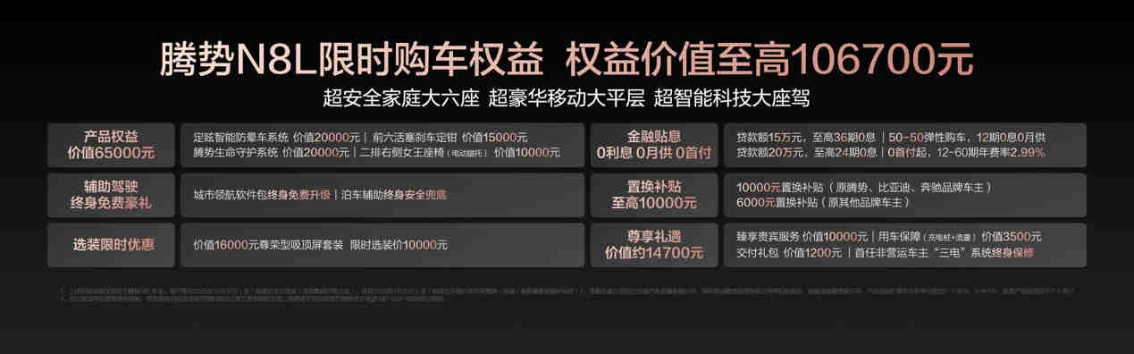 騰勢N8L售價為29.98萬元-32.98萬元,上市以來持續(xù)熱銷,為回饋用戶厚愛,推出限時購車權(quán)益,價值最高達10.67萬元!包括價值1.7萬元的三年免息,最高1萬元的置換補貼。此外,在2025年11月30日24點前完成合同簽署的用戶,如果因非用戶原因車輛未及時交付,導致開票實際發(fā)生在2026年,可享受購置稅差額補貼,最高1.5萬元!用戶不必擔心因為交車晚,而享受不到購置稅補貼。