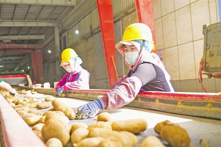 在農(nóng)業(yè)產(chǎn)業(yè)化國(guó)家重點(diǎn)龍頭企業(yè)——雪川六盤山食品(寧夏)有限公司的智能化生產(chǎn)車間里,原州區(qū)中河鄉(xiāng)硝口村村民馬存花熟練地挑揀著傳送帶上的馬鈴薯。