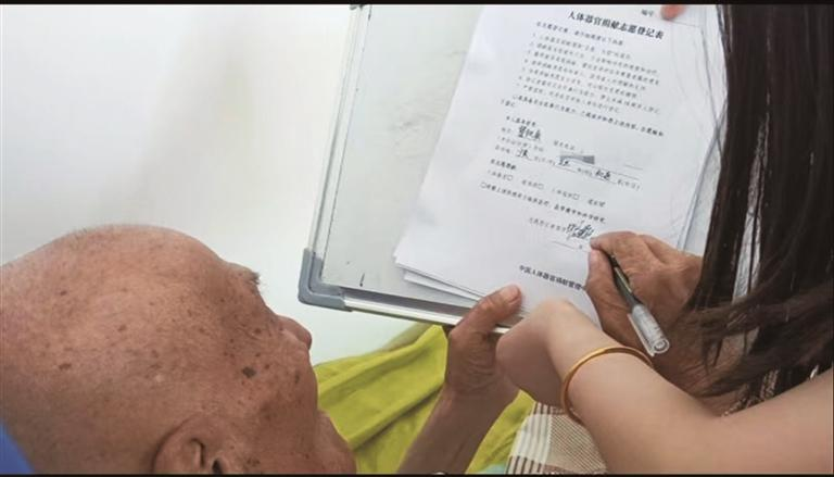 翟鐵顏老人在眼角膜捐獻(xiàn)專項(xiàng)登記表上簽名。受訪者供圖