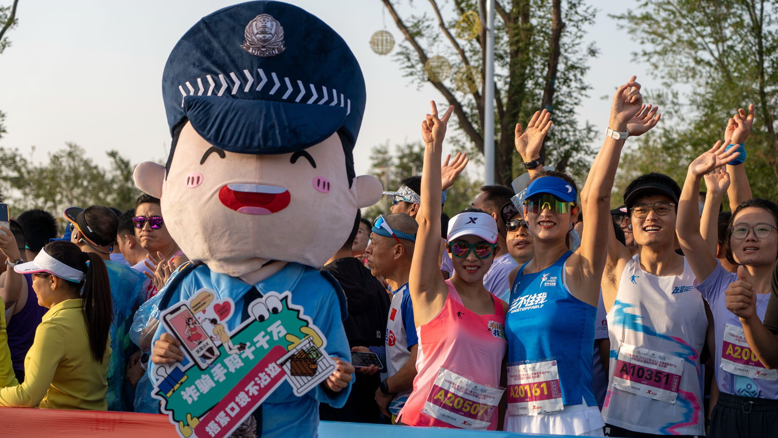 賽事當(dāng)日,4000余張“別讓騙子跑過(guò)你”主題貼畫在起跑區(qū)掀起一場(chǎng)熱烈的“反詐加油”浪潮。民警手持貼畫穿梭在人群中,熱情地將一張張色彩鮮艷、設(shè)計(jì)活潑的反詐貼畫輕輕貼在跑者們的參賽服上。