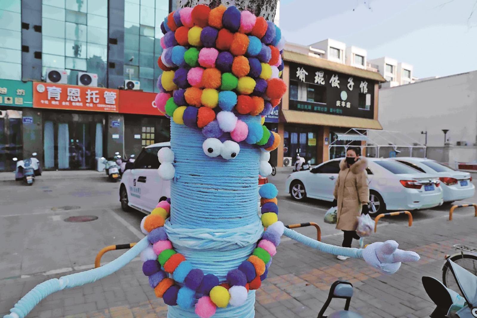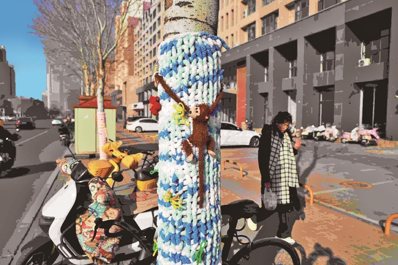冬日里,當寒風染黃枝頭,當落葉鋪滿小徑,愛心人士用奇思妙想為銀川的樹木披上溫暖又別致的“毛衣”(12月15日攝)。