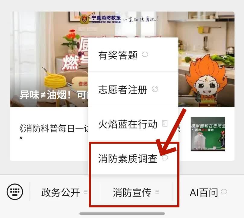 參與方式一:微信搜索“寧夏消防”公眾號(hào),點(diǎn)擊進(jìn)入公眾號(hào)頁(yè)面,按照?qǐng)D示進(jìn)入調(diào)查頁(yè)面。