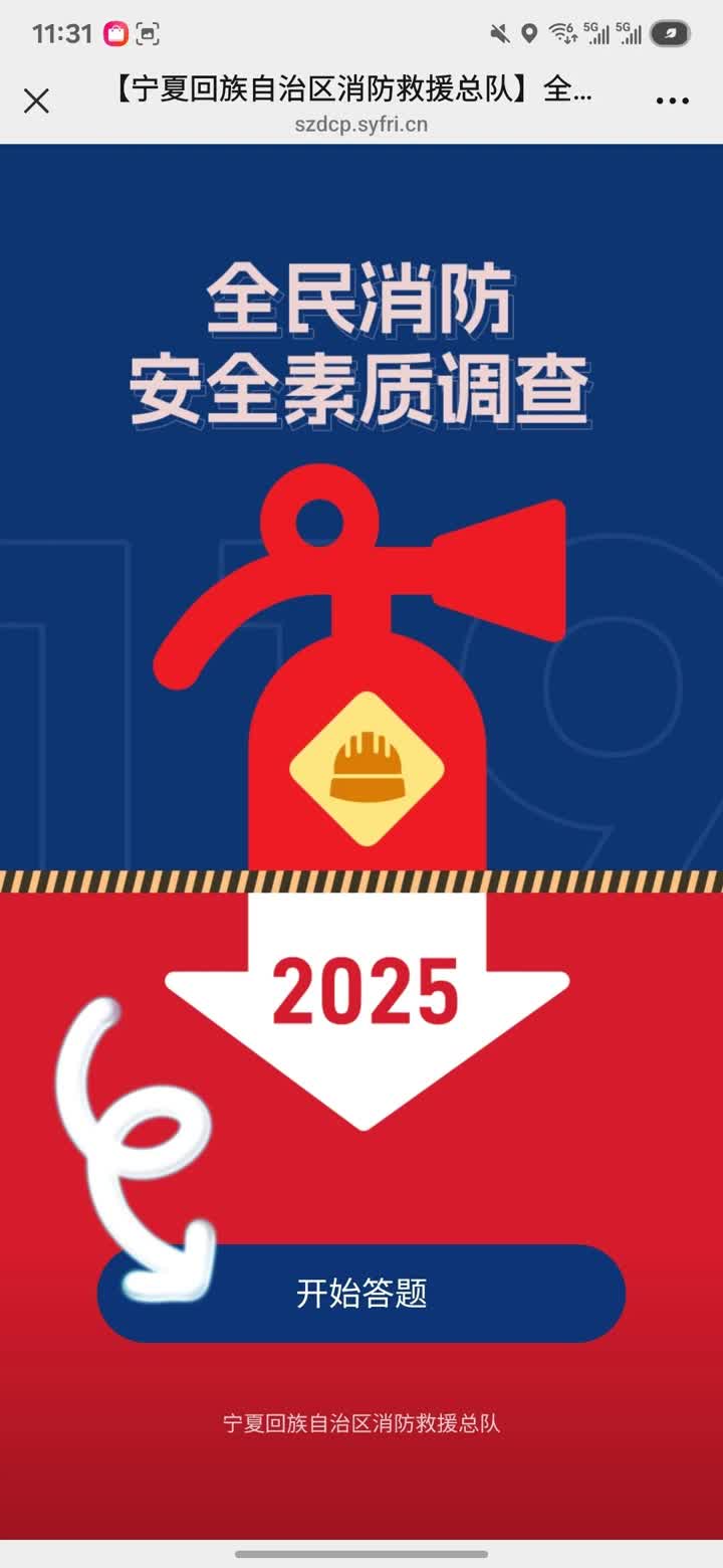 為全面掌握寧夏地區(qū)全民消防安全素質(zhì)整體狀況,科學(xué)評(píng)估社會(huì)公眾及重點(diǎn)群體的消防安全意識(shí)、自防自救能力,切實(shí)提升全區(qū)火災(zāi)防控綜合效能,寧夏消防救援總隊(duì)在全區(qū)范圍內(nèi)組織開展消防安全素質(zhì)測(cè)評(píng)與調(diào)查。